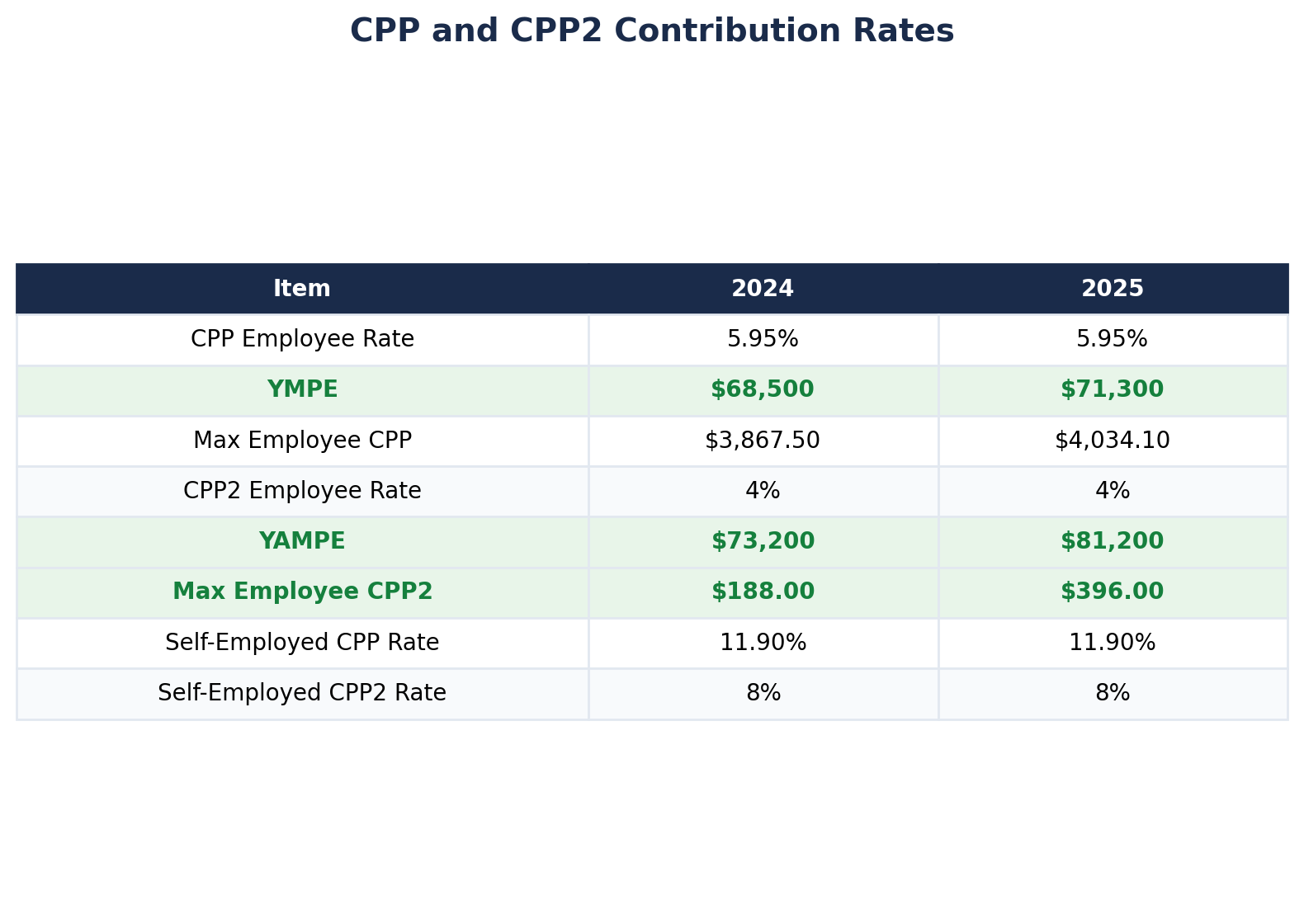 Self-employed individuals pay both the employee and employer portions of CPP, for a combined rate of 11.90% on earnings up to the YMPE ($71,300). For CPP2, the self-employed rate is 8% on earnings between $71,300 and $81,200, with a maximum CPP2 contribution of $792.